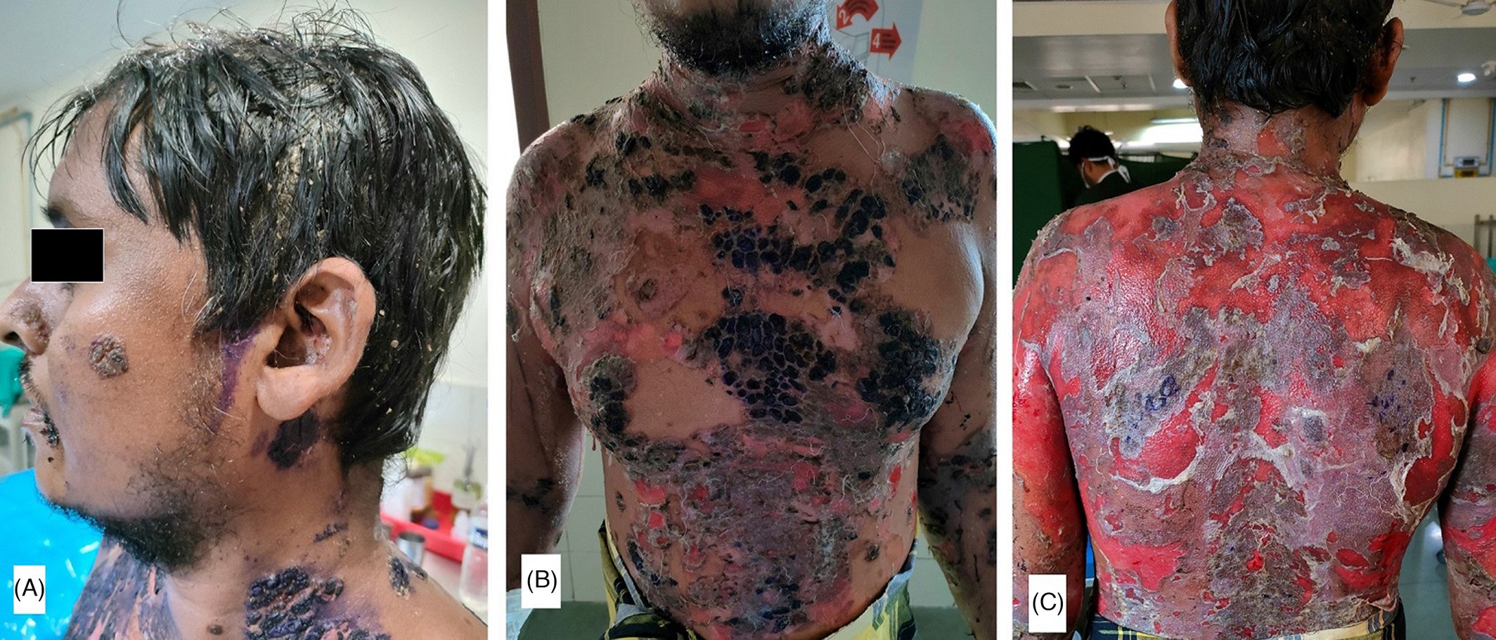 (A) Multiple crusted erosions over face and left ear along with matted hairs over scalp; (B) multiple crusted erosions with overlying gentian violet seen on chest and abdomen; (C): extensive erosions with some islands of normal skin present over whole back