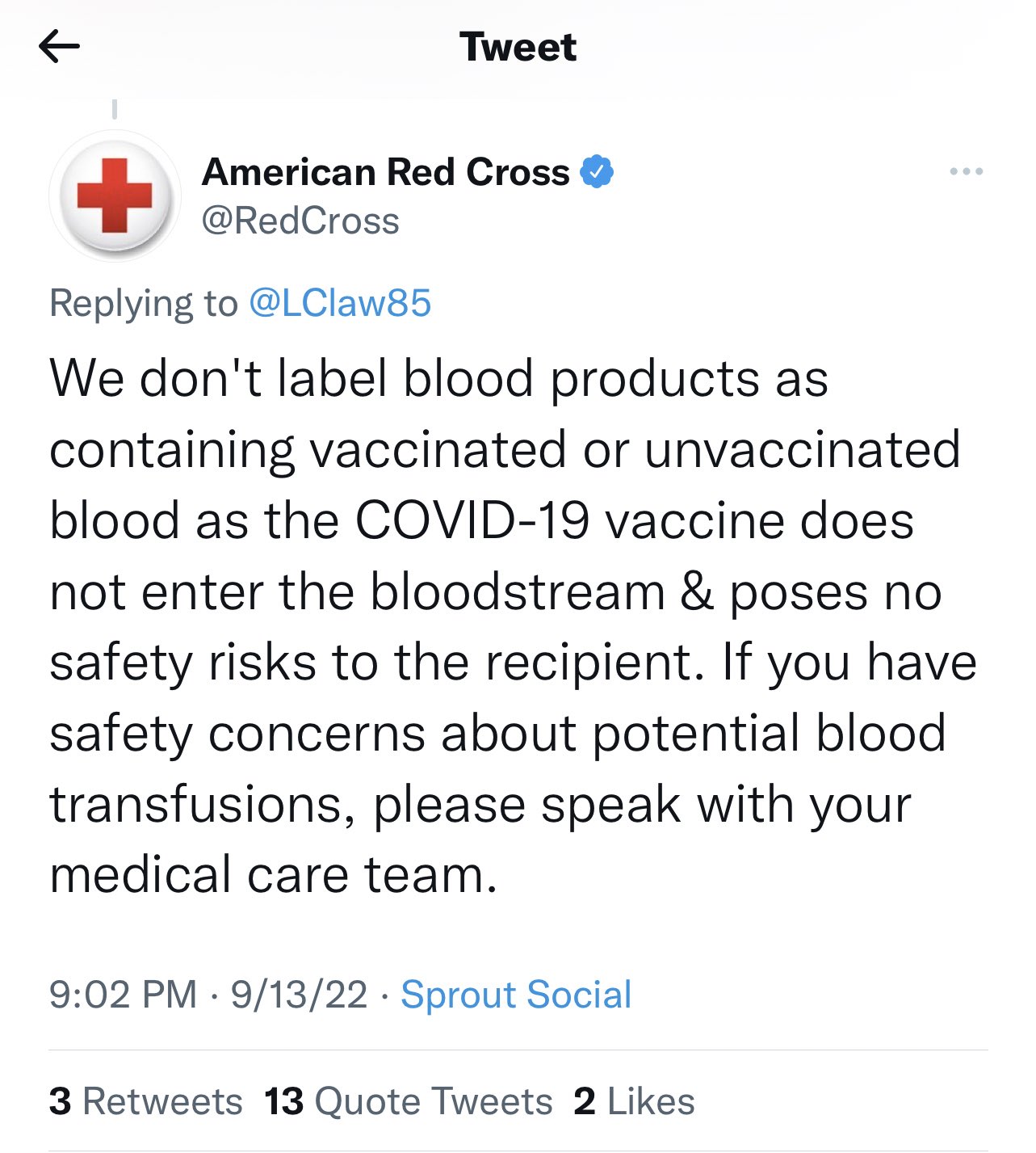Earlier this month (September 2022), the Red Cross admitted that they don’t label blood products as originating from COVID-19 vaccinated people or blood from unvaccinated people.