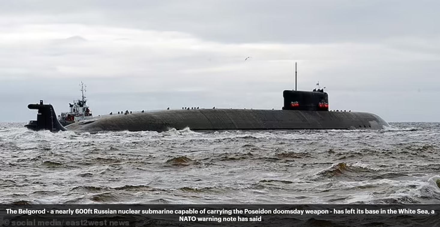 The nearly 600ft Belgorod submarine has disappeared from its home base in the Arctic Circle and may be on its way to the Kara Sea to test the Poseidon nuke, a NATO warning note leaked over the weekend has suggested.