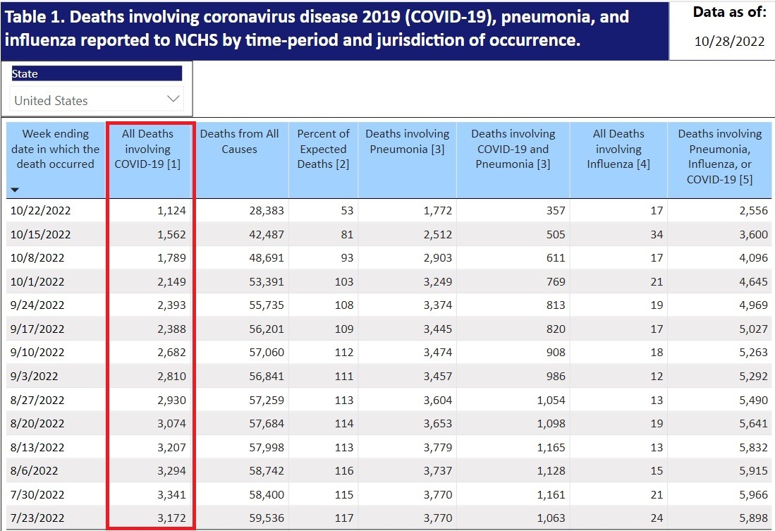 The CDC and the U.S. Government are trying to convince the public that without these new booster shots, their chances of dying from COVID are much higher, but the CDC’s own statistics show that “All Deaths Involving COVID-19” have been steadily declining since the end of July, even though the new Bivalent booster shots were not approved until the end of August.