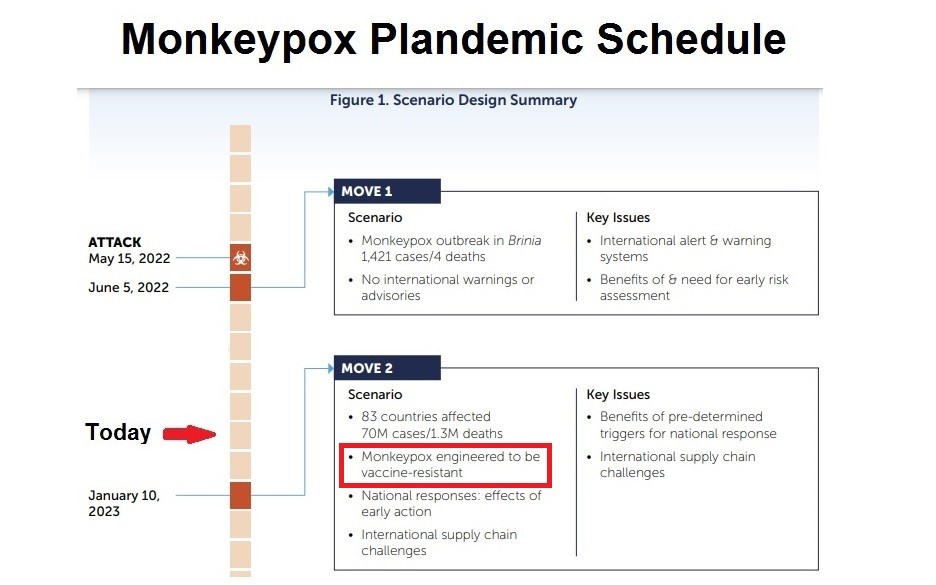 The name of the virus in this simulation was the “monkeypox” virus, and it included an event where this virus would be “engineered to be vaccine-resistant.”