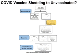 Less data exist on Spike protein shedding but it is not a far stretch to understand this is well within the realm of reality. The pivotal questions are: 1) for how long is a recently vaccinated person at risk to shed on to others? 2) can shed mRNA be taken up by the recipient and begin to produce Spike protein just like vaccination? 3) can shed Spike protein cause disease as it does in the vaccinated (e.g. myocarditis, blood clots, etc.)?