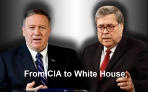 Left: Mike Pompeo, director of the CIA from 2017 to 2018 and Secretary of State under President Donald Trump from from 2018 to 2021. Right: Bill Barr worked for the CIA from 1971 to 1977 and served as U.S. Attorney General under President George H. W. Bush (who was also a former Director of the CIA) from 1991–1993, and as U.S. Attorney General under President Donald Trump from 2019-2020.