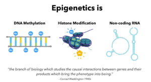 Epigenetics (epi means “above” genetics) is a term given to mechanisms that do not alter genes in our DNA, but rather turn genes off or on (or influence whether they are turned off or on). Epigenetic mechanisms are complicated and enable organisms to adapt intelligently and rapidly to challenging environments.