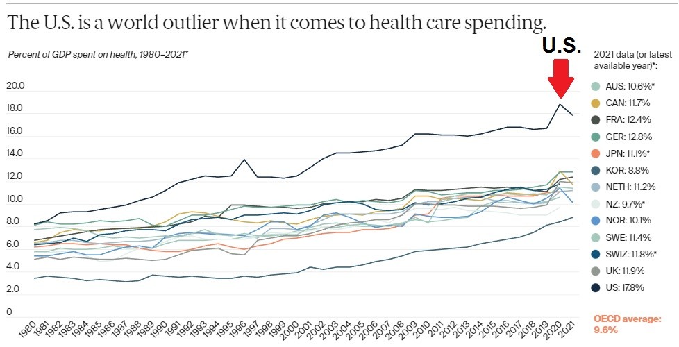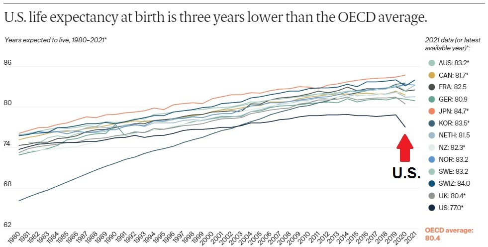 We spend more money on “healthcare” than any other developed country, and yet we have the worst health outcomes among developed countries, including the lowest life expectancy, and the highest rates of mothers and babies dying at childbirth, compared to other wealthy countries.