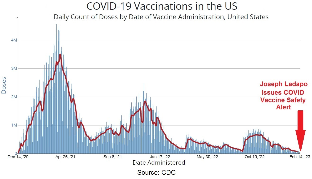 And now 2 years later here in 2023, after 670,987,625 doses of COVID-19 bioweapon shots have been injected into the bodies of Americans, and with people currently receiving COVID-19 shots at the lowest level since they were given emergency use authorizations, Florida’s Surgeon General Joseph Ladapo has issued a “Health Alert on mRNA COVID-19 Vaccine Safety” on February 15, 2023 based on the Government’s own statistics in VAERS.