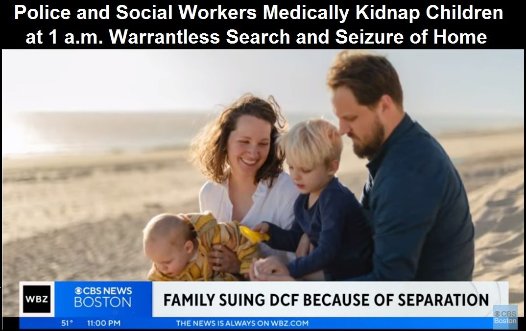 A family who took their 3-month-old son to an emergency room in Waltham, Massachusetts last year at the advice of their pediatrician because the infant had a 103 degree fever, is now suing Waltham police and social workers who came to their home unannounced at 1 a.m. in the morning and forced their way into their home to remove both their 3-month-old baby and his 3-year-old brother, with no warrant, simply because an x-ray taken of the baby a couple of days earlier showed a healed fractured rib in the baby.