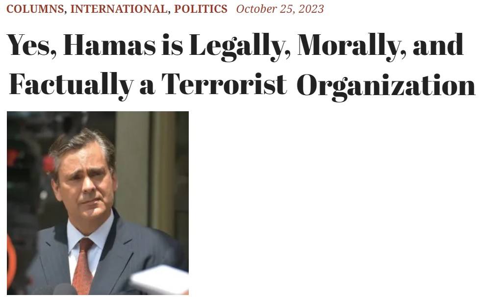 One of those is journalist Jonathan Turley, who this week wrote an article titled: Yes, Hamas is Legally, Morally, and Factually a Terrorist Organization. (Source.)