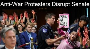 Today, protesters disrupted a Senate Committee hearing in Washington D.C. on sending aid to Israel, holding up hands and arms painted in blood red, with many of them being arrested.