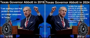 This dichotomy became especially ironic when Abbott called in the Texas State Department Of Public Safety to break up a pro-Palestinian demonstration on the campus of the University of Texas in Austin after he previously had signed a law into effect that aimed to protect students rights to free speech on college campuses in the wake of suppression against non-politically correct demonstrations against the progressive orthodoxy of academia.