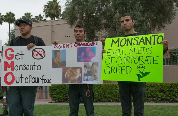 LOS ANGELES CA – MAY 24: Protesters rallied in the streets against the Monsanto corporation. The company is accused of genetically modifying foods unsafely. May 24 2014 in Los Angeles California.