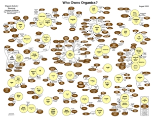 Philip Howard, a member of the International Panel of Experts on Sustainable Food Systems and a professor at Michigan State University, has tracked the takeover of small, organic businesses, by corporate food since 2003, and his latest graphic image showing this consolidation updated in 2020 is the feature image of this article above.