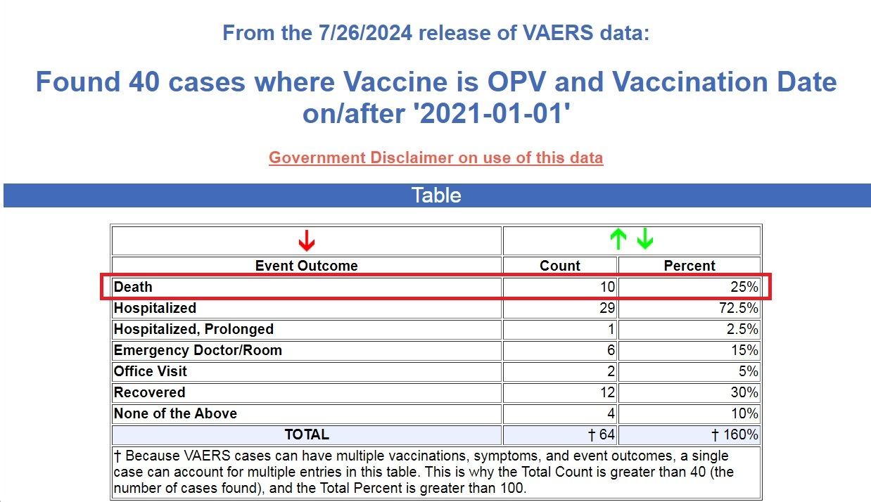 ومع ذلك، تبلغ نسبة الوفيات الناجمة عن لقاح شلل الأطفال الفموي الجديد، الذي حصل على ”تصريح استخدام طارئ“ (EUA)، حاليًا حوالي 25% من جميع إصابات اللقاح الناجمة عن لقاح شلل الأطفال الفموي الجديد، وفقًا لقاعدة بيانات الحكومة الأمريكية لنظام الإبلاغ عن الأحداث الضارة للقاحات (VAERS). (المصدر)