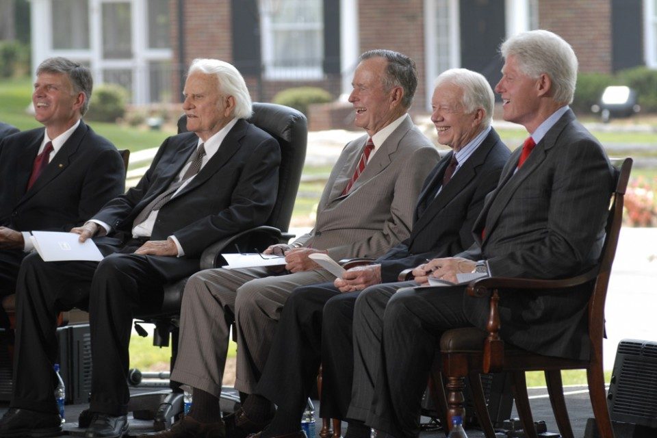 Franklin Graham, Billy Graham, President George H.W. Bush, President Jimmy Carter and President Bill Clinton at the dedication of the Billy Graham Library in Charlotte, North Carolina, in 2007. (Image source.)