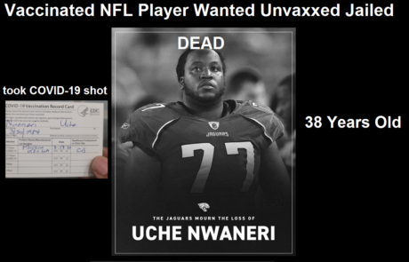 With the collapse of NFL player Damar Hamlin live on Monday Night Football this week, and all the speculation about whether or not his heart attack was related to the COVID-19 shots, the death of former Jacksonville Jaguars offensive lineman Uche Nwaneri has received far less media attention.  Nwaneri is another name added to a growing list of people who publicly flouted their COVID-19 vaccination status, and then vilified those "anti-vaxxers" who refuse to be injected, going so far as to call for the "anti-vaxxers" to be sent to jail, and has now "died unexpectedly" at the age of 38.