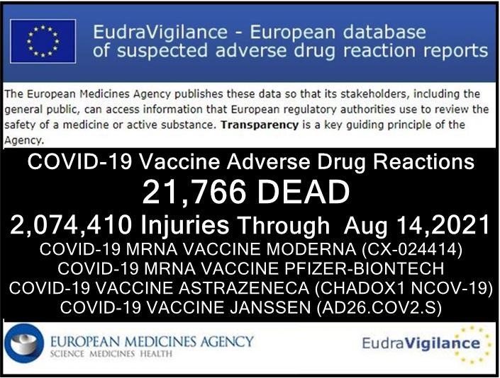 The European (EEA and non-EEA countries) database of suspected drug reaction reports is EudraVigilance, verified by the European Medicines Agency (EMA), and they are now reporting 48,817 fatalities, and 5,107,883 injuries following injections of four experimental COVID-19 shots. From the total of injuries recorded, almost half of them (2,177,286) are "serious" injuries: “Seriousness provides information on the suspected undesirable effect; it can be classified as ‘serious’ if it corresponds to a medical occurrence that results in death, is life-threatening, requires inpatient hospitalisation, results in another medically important condition, or prolongation of existing hospitalisation, results in persistent or significant disability or incapacity, or is a congenital anomaly/birth defect.” European politicians and others are waking up to the fact that these shots are killing and maiming people, especially young, formerly healthy people. So where's the justice? Not only is the EMA not halting these killer shots, they just approved a new one by GSK and Sanofi.